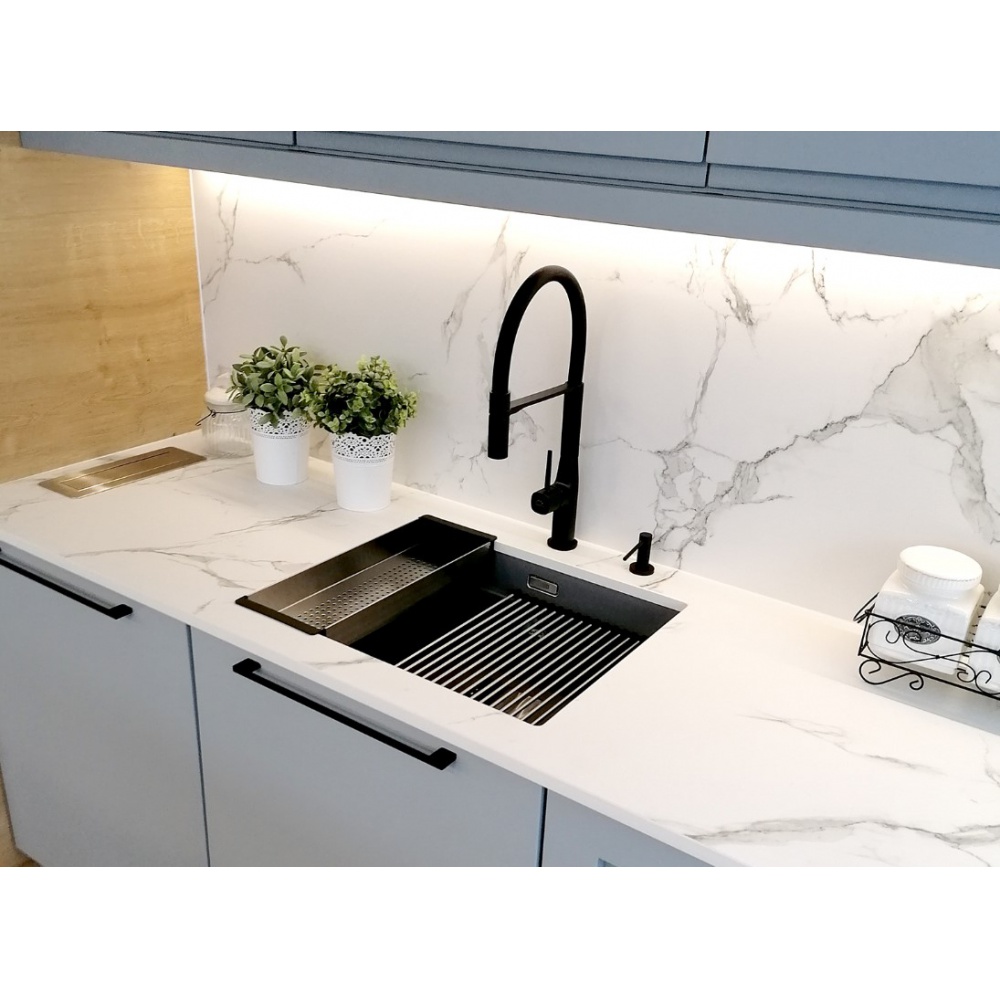 Černé interiérové prvky, jako černý granitový dřez a černá kuchyňská baterie, dodávají prostoru styl a eleganci. I díky těmto vlastnostem se tato kombinace stala velmi populární volbou v současném interiérovém designu.