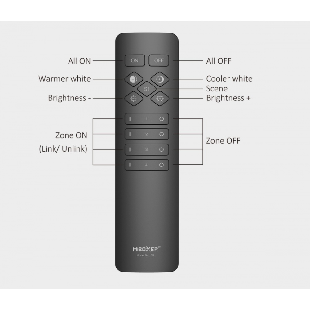dálkový ovladač pro jednobarevné a CCT LED, 4 zóny, Mi-Light - černá