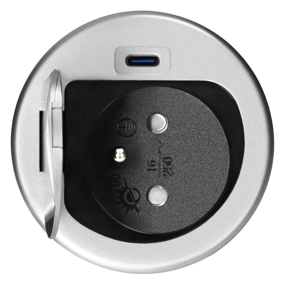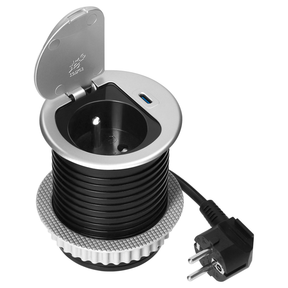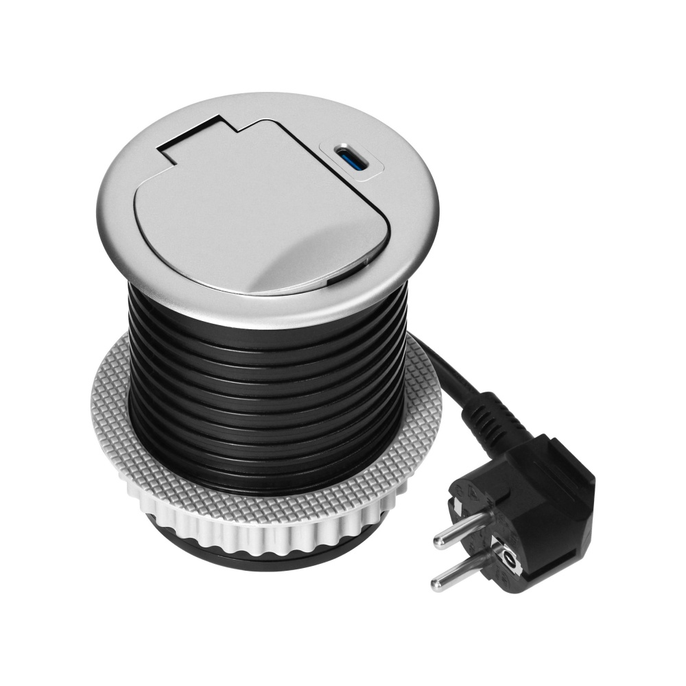 ORNO zásuvka elektro stolová kulatá 60 mm-1x zásuvka+1xUSB-C+kabel stříbrná/plast