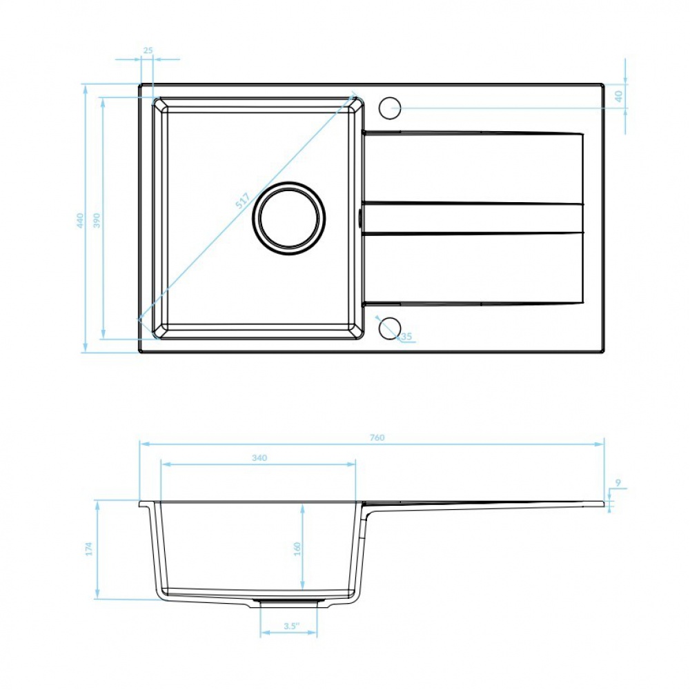 Dřez je navržený s možností oboustranné instalace. Lze jej umístit s odkapávací plochou na pravé nebo levé straně. Předvrtané otvory umožňují instalaci kuchyňské baterie přímo na dřez, instalaci ovládače výpusti nebo integrovaného dávkovače saponátu.