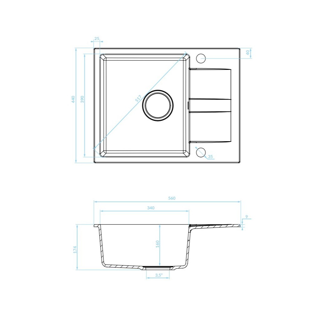 Dřez je navržený s možností oboustranné instalace. Lze jej umístit s odkapávací plochou na pravé nebo levé straně. Předvrtané otvory umožňují instalaci kuchyňské baterie přímo na dřez, instalaci ovládače výpusti nebo integrovaného dávkovače saponátu.