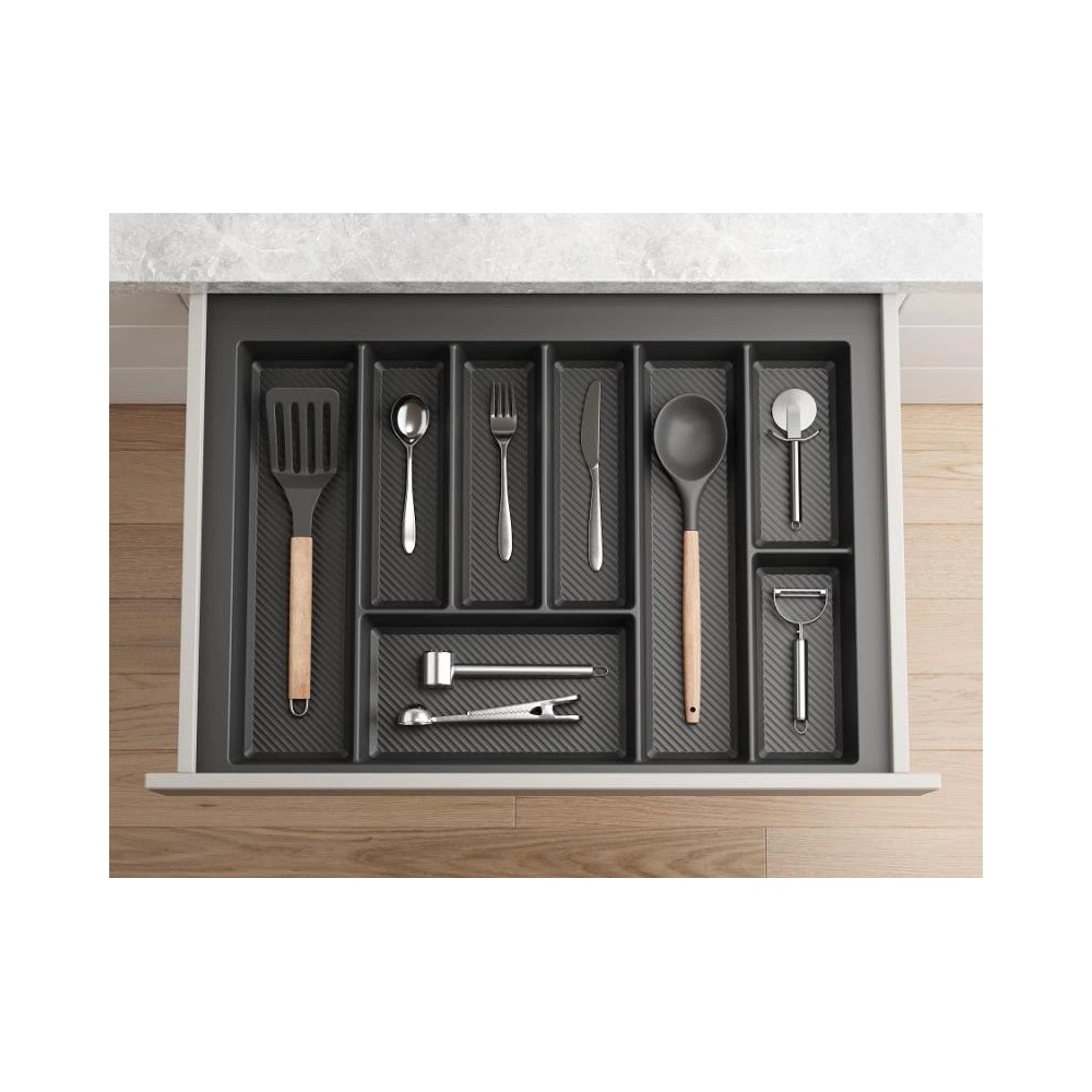 Vysoce kvalitní plast tloušťky 2 mm se speciální žebrovanou strukturou zaručuje výjimečnou odolnost a trvanlivost. Drážky na dně příborníku navíc eliminují pohyb předmětů při manipulaci se zásuvkou a usnadňují uchopení menších předmětů.