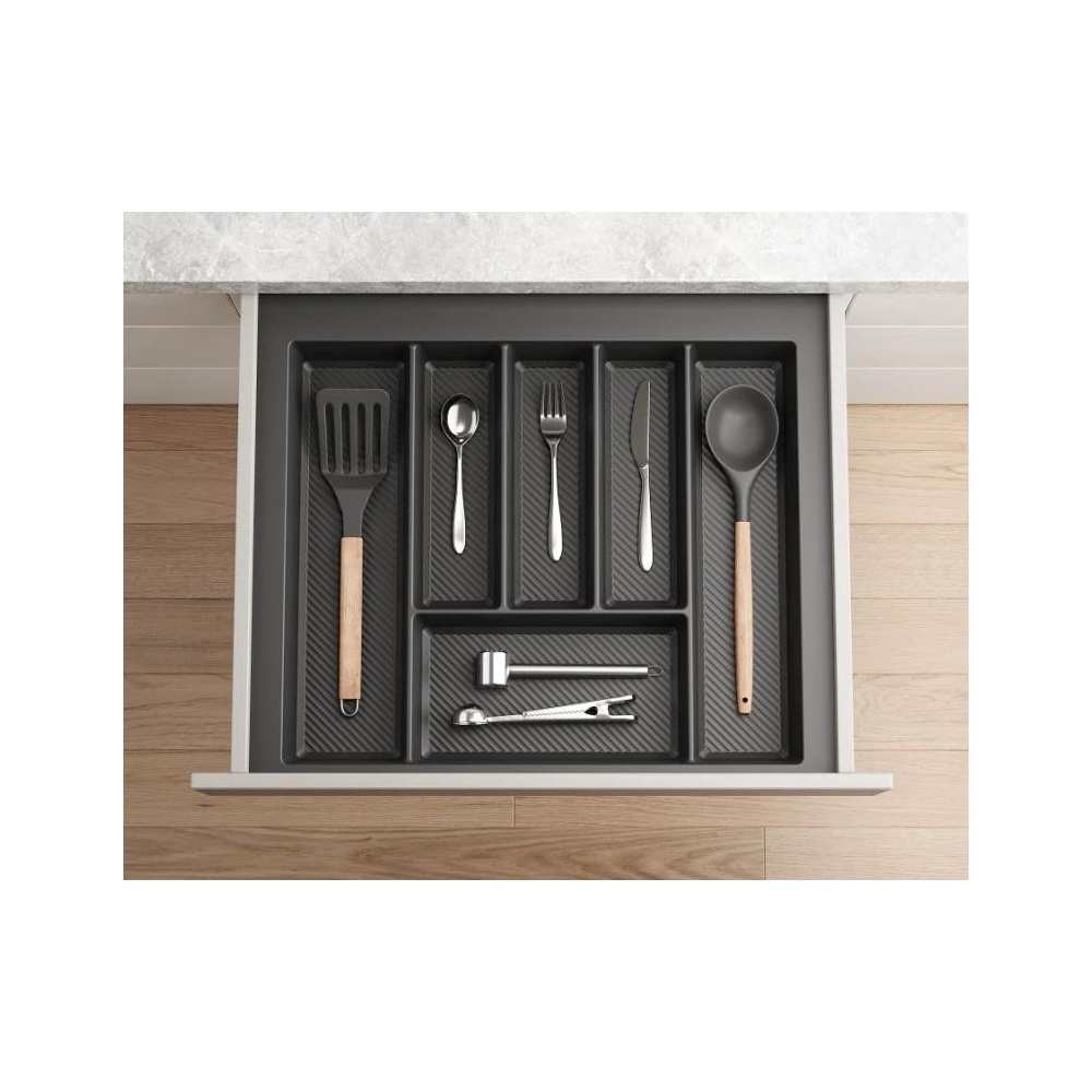 Vysoce kvalitní plast tloušťky 2 mm se speciální žebrovanou strukturou zaručuje výjimečnou odolnost a trvanlivost. Drážky na dně příborníku navíc eliminují pohyb předmětů při manipulaci se zásuvkou a usnadňují uchopení menších předmětů.